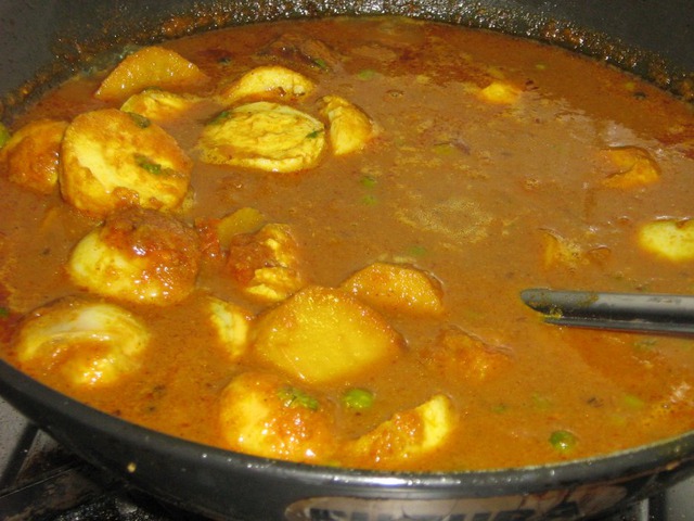 Положить яйца, соль, покипятить 2-3 минуты, проверить на соль, если есть Garam masala, добавить полчайной ложки ( для тех, кто любит поострее). Убрать крупные специи, перед подачей посыпать зеленью кинзы, подают с рисом и лепёшками роти.