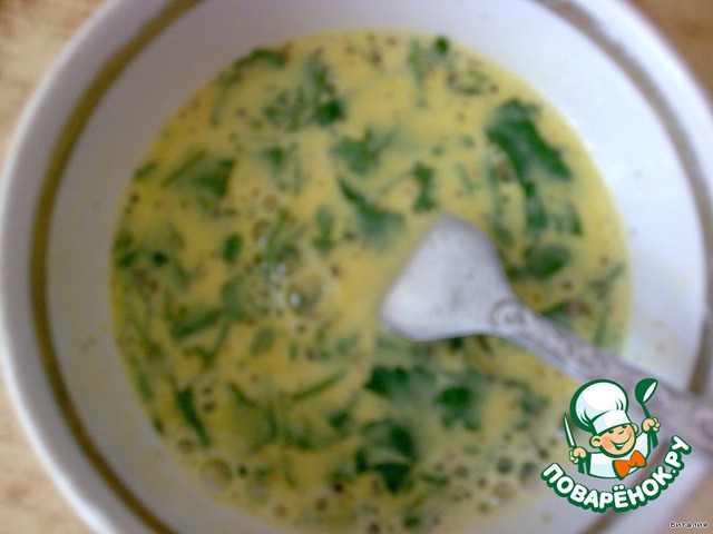 Яйцо взбить с солью, перцем, приправой, петрушкой, добавить молоко.