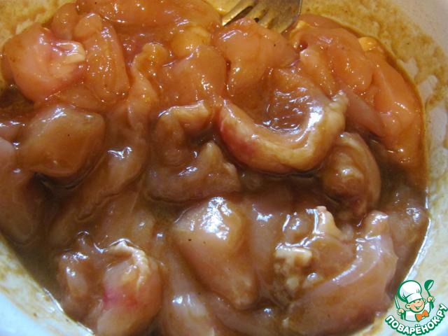 Мясо режем длинными брусочками. В миске смешиваем соевый соус, оливковое масло и имбирь, кладём туда мясо-перемешиваем и оставляем мариноваться на 30 мин.