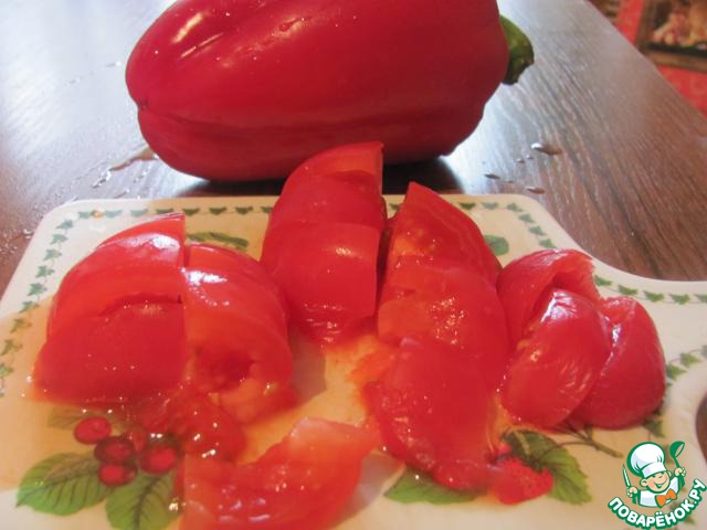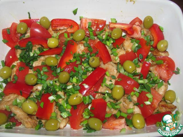 В это время можно приготовить овощи:нарезаем помидор и перец кубиками. Оливки напополам, зелёный лук мелко крошим.