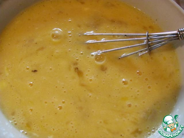И сразу приготовим на омлет всё:яйца разбить в миску, добавить соль, перец, муку-всё перемешать до однородности.