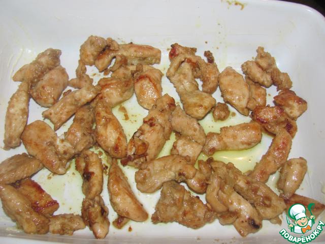 Наше мяско замариновалось-идём его обжаривать. На сковороду налить растительное масло, прогреть её хорошо и выложить мясо. Обжарить его на большом огне 5 мин, помешивая. Форму смазываем растительным маслом, выкладываем мясо.