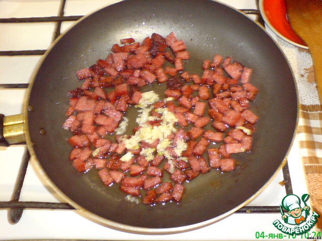 Когда колбаса поджарится до золотистого цвета, добавить чеснок. Чеснок, предварительно, выдавить или мелко нарезать.