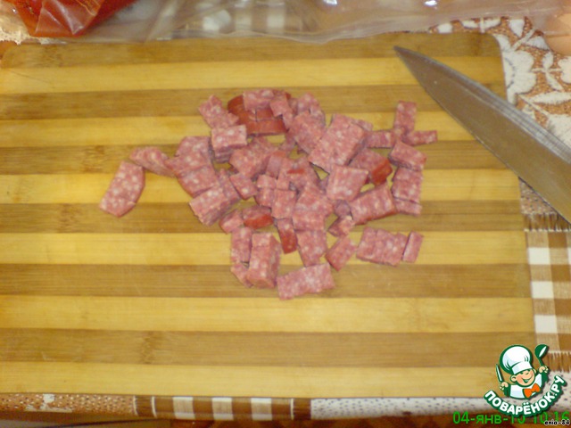Колбасу нарезать на небольшие кусочки и выложить на разогретую сковороду.