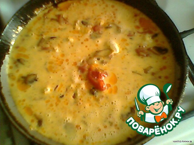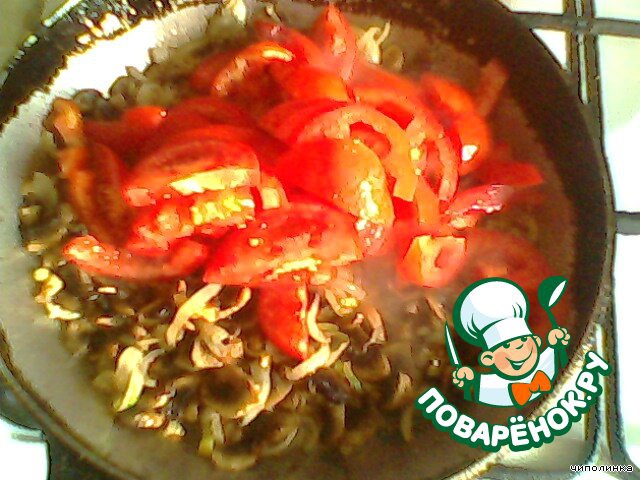 Когда помидоры немного обжарятся, залить яичной смесью, накрыть крышкой и довести до готовности.