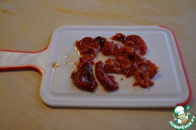 Печеный маринованный перец или вяленые томаты порезать небольшими кубиками.