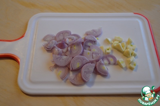 Лук-шалот почистить и порезать полукольцами, почистить чеснок порезать кубиками.
