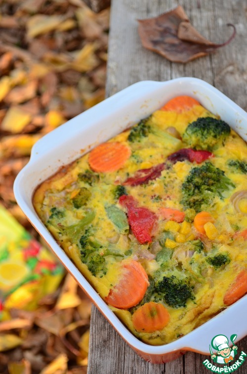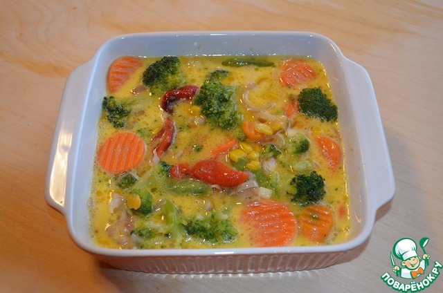 Выливаем взбитые яйца в форму для запекания. Равномерно выкладываем овощи. Выпекаем в духовке разогретой да 180 градусов 15-20 минут.