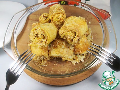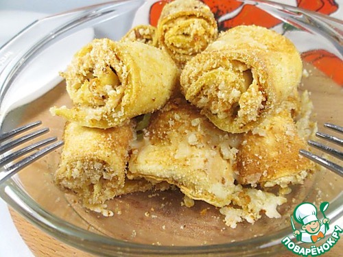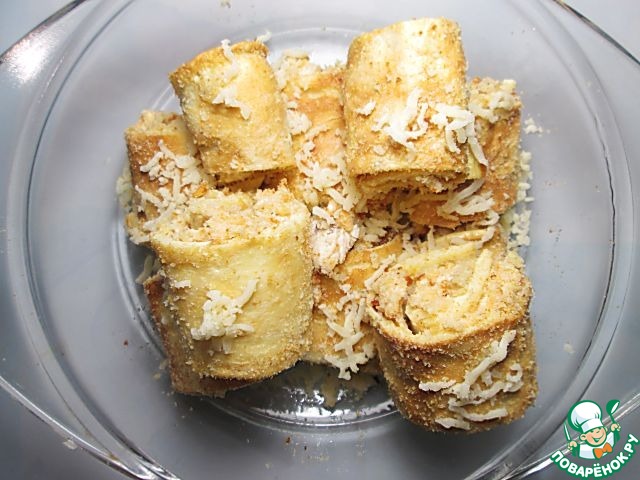 | Изумительно вкусно! Нежные запеченные рулетики в панировке с сырно-куриной начинкой. А самое интересное, в готовом виде сложно догадаться, что основной компонент рулетиков - ни что иное, как обычный тонкий омлет! |
