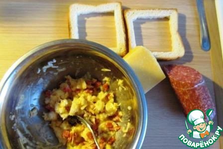Из кусков хлеба вырезаем квадратик, оставляя рамочку со стенками в 1 см толщиной. Мякиш крошим в миску, добавляем тертый сыр, кубики колбасы и яйцо.