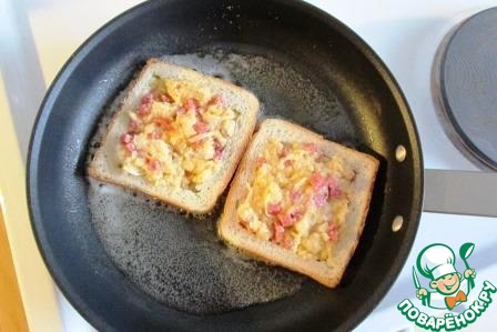 Хлебные рамочки укладываем на сковороду с разогретым маслом и плотненько заполняем фаршем