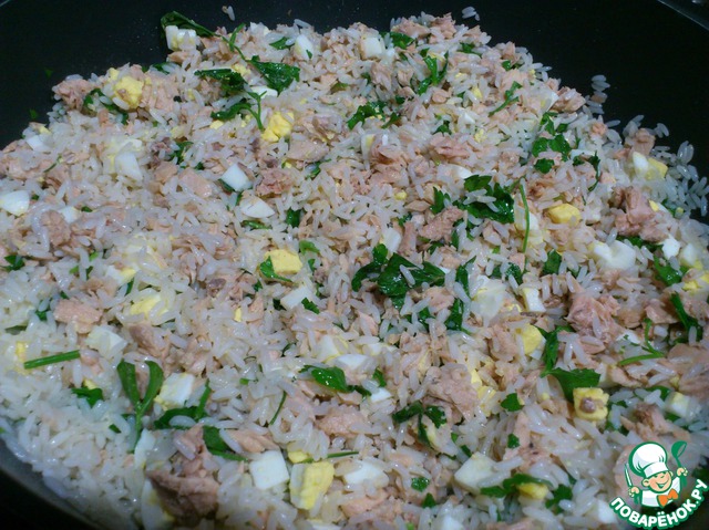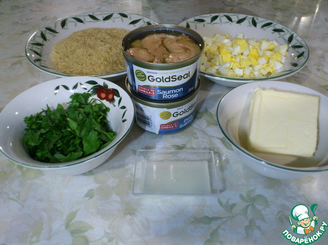 Пока варится рис, очищаем горбушу от кожи и косточек и разминаем на небольшие кусочки. Жидкость нам не понадобится.