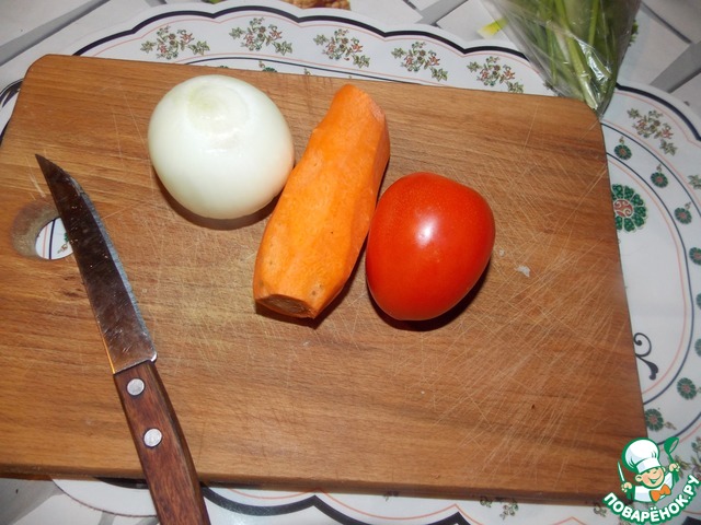 Лук, морковку почистить.. Лук порезать, морковку потереть, помидорку порезать и обжарить на под. масле в течении минут 5..