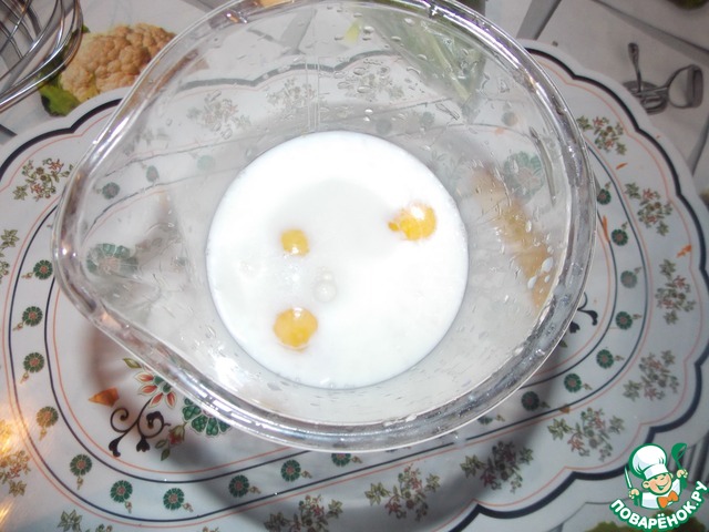 В молоко, добавить яйца.. И хорошо взбить венчиком..