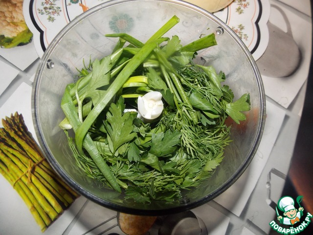 В то время пока омлеты готовятся, делаем овошной соус.. Измельчаем зелень..