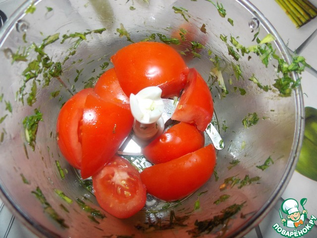 Так же измельчаем 2 помидора..