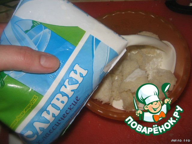 Значит, так. Для начала, пару кусочков батона, без корочки, заливаю сливками.