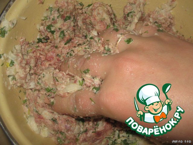 Вымешиваю фарш. Всегда делаю это руками.