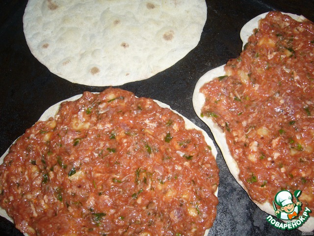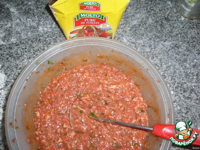 Для ламанджо, по идее, нужен бараний фарш. Но баранину у нас редко можно приобрести. Поэтому я частенько использую обычный говяжий фарш - вкус от этого не страдает. Итак, берём полкило фарша, добавляем в него 1 большую (или 2 средние) хорошо перемолотые в мясорубке луковицу и чеснок, меленько порезаную зелень (петрушку, кинзу, базилик, можно всё вместе, а можете убрать то, что вам не нравиться), добавляем соль, перец по вкусу. Иногда я добавляю в общую массу меленько порезанный горький перец - но это уже по вашему желанию. Выливаем в фарш томатное пюре. Если нету пюре - разбавьте томатную пасту до консистенции сметаны, а иногда я перекручиваю свежие помидоры - тоже прекрасно подходит. Хорошенько всё перемешиваем. Фарш должен получиться жидким, как густой соус.