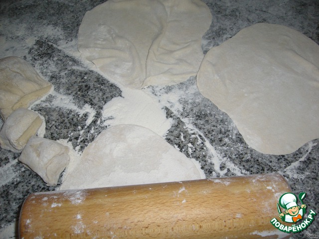 Когда тесто слегка подойдёт, разделить его на небольшие (размером с кулачок ребёнка) шарики и раскатать тоненькие (очень тоненькие)лепёшки. Очень легко раскатать тоненько, если шарик теста выложить прям в мучную горку - тогда без каких либо разрывов раскатывается прям до прозрачного состояния, а лишняя мука после легко стряхивается