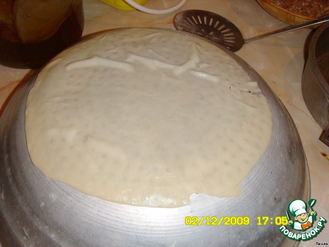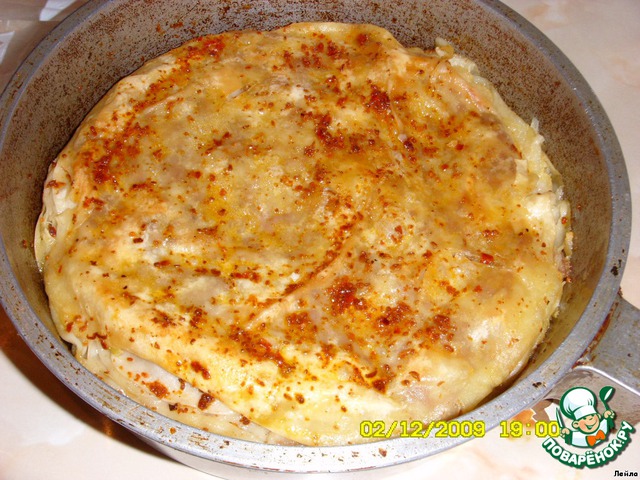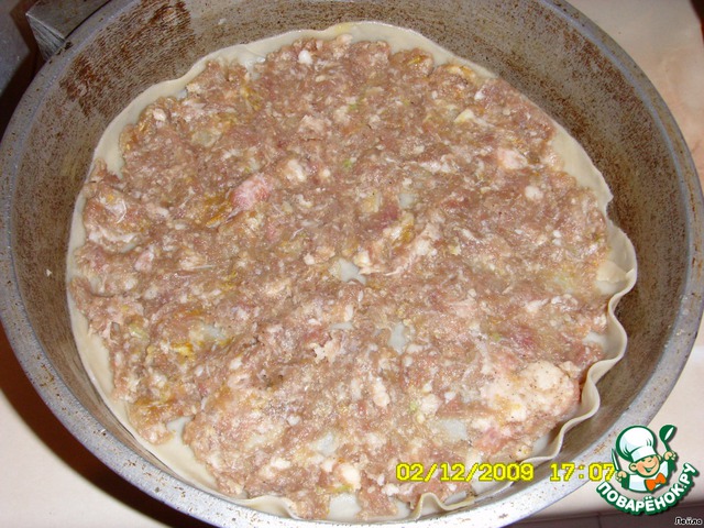 Лист-пласт теста смазать маслом и положить в сковородку. Сверху равномерно положить фарш.