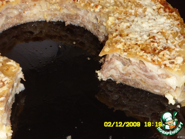Так повторяем - слоями выкладываем тесто, смазываем маслом, сверху фарш.