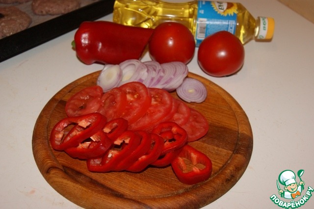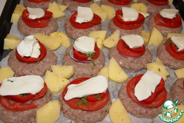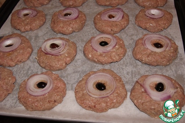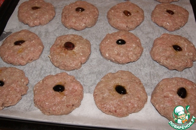 Сформовать 18 бифштексов и поместить их на противень застеленный пекарской бумагой и смазанный 1 ст. л. масла. В центр каждого бифштекса вдавить маслину.