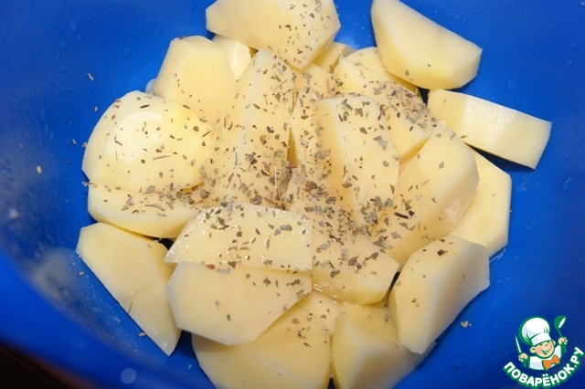 Картофель нарезать крупными дольками, добавить соль, 1 ст. л. масла и 1/2 ч. л. орегано, поперчить и хорошо перемешать.