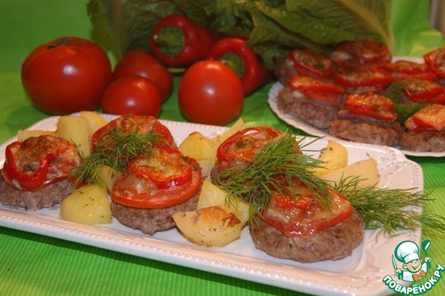 Распределить между бифштексами картофель и запекать в прогретой до 190"С духовку 20-25 минут. Ориентируйтесь на вашу духовку!