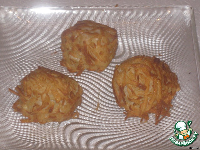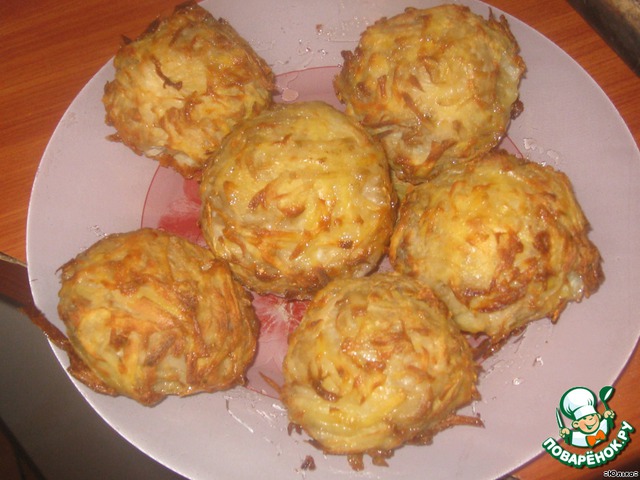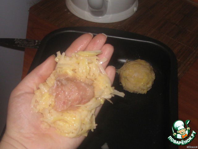 Делаем небольшую лепешку из картофельного "теста".В центр лепешки кладем куриный фарш и формируем шарики с сердцевиной из фарша.