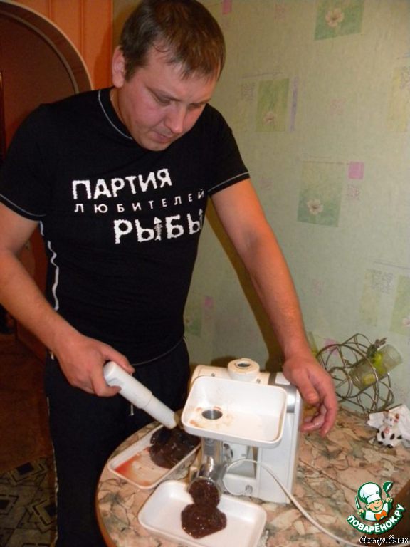 Пропускаем через мясорубку фарш вместе с печенью, конечно, это делал наш глава семьи.