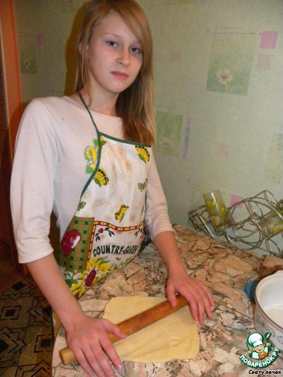 Тесто раскатываем и выкладываем в форму так, чтобы были закрыты дно и стенки. Это делала моя дочка Александра.