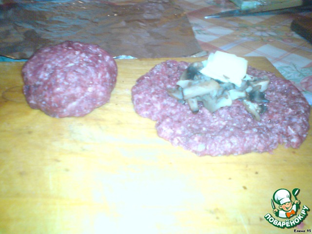 2. Отбиваем фарш, катаем шарики размером с мандаринку, затем шарики раскатываем в лепёшку. В центре выкладываем грибочки, кусочек сливочного масла и сыра. Закрываем чтобы снова получился шарик.
