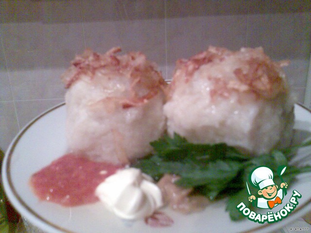 За это время жарим лук на копчёном сале, хотя можно на солёном и даже сыром.У меня вообще не было никакого, а цеппелинчиков детям захотелось, так я лук поджарила на растительном масле(первый раз попробовала).