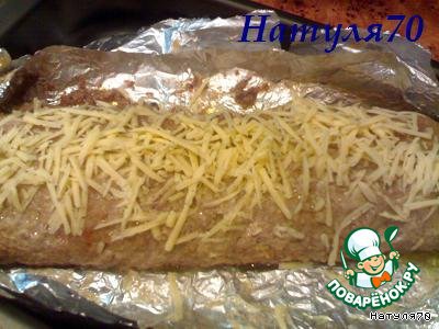 Через 20 минут достаем рулет, раскрываем и сверху посыпаем оставшимся сыром
