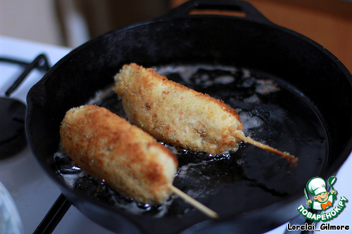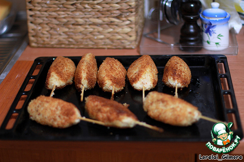 Уже должны быть готовы панировочные сухари, взбитое яйцо и миска с водой, чтобы смачивать руки и шпажки.