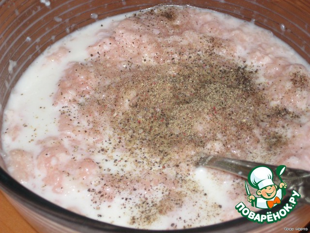 Берем куриный фарш, солим его, перчим, добавляем специи по вкусу, перемешиваем, вливаем сливки, еще раз перемешиваем.