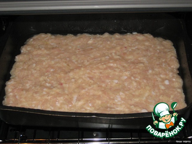 Форму смазываем растительным маслом, выкладываем половину фарша и ставим в разогретую духовку при 180*С на 15 минут.