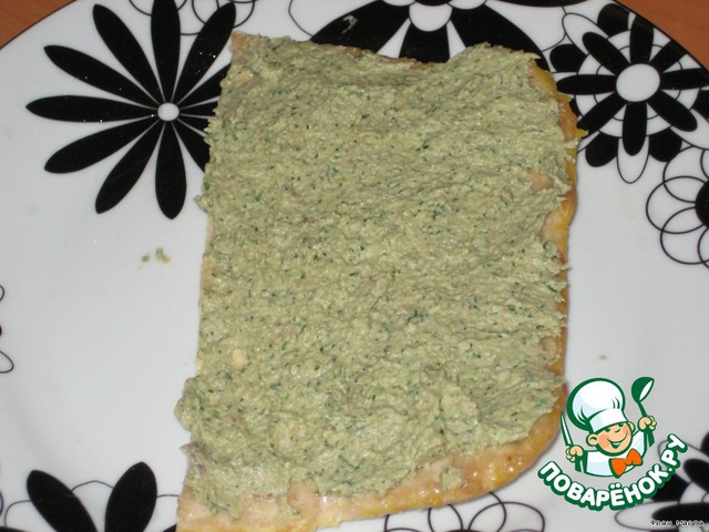 Я коржи резала поперек пополам, потому что они у меня слишком большие получились (нет маленькой формы). Каждый корж промазываем нашим сырно-чесночно-грибным кремом, даем немного постоять (пропитаться).