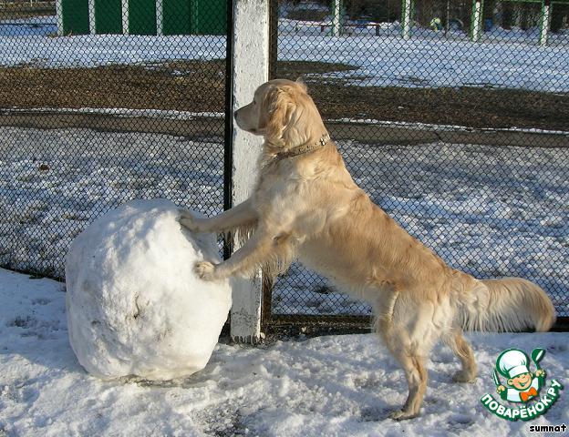 Приступили к работе с таким рвением и старанием, что даже дворовый пес Морозко захотел помочь. И вроде бы по отдельности лепили все части, что были запланированы, а в результате получился снеговик…