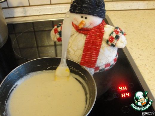 Затем в однородную масляно-мучную смесь Снеговик небольшими порциями влил процеженное молоко, каждый раз тщательно перемешивая. Когда платье загустело, Паша снял его с огня и слегка украсил щепотками соли, перца и молотого мускатного ореха.