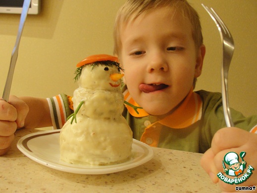 Это блюдо должно подаваться горячим. Я сделала так: заранее, с вечера, приготовила и пюре, и котлетки, и сырно-грибную смесь. А с утра накатала шариков, сформировала фигурки и сварила соус. Пока «Бешамель» чуть остывал, разогрела заготовки в микроволновке, обмазала их теплым соусом, быстренько «сделала» лицо и подавала. Кстати, чуть не забыла – нос морковкой никак не желал держаться на «лице» (а какая же девушка захочет на своем лице нос морковкой?