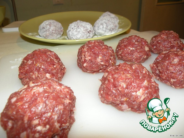 В говяжий фарш разбиваем яйцо, на терке трем луковицу и добавляем специи по вкусу, хорошенько перемешиваем, лепим тефтельки того размера, что Вам же вкуснее ))) и обваливаем в муке