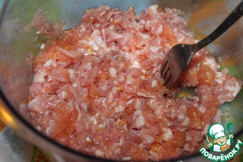 Соединить фарш и помидоры, посолить, поперчить, перемешать.