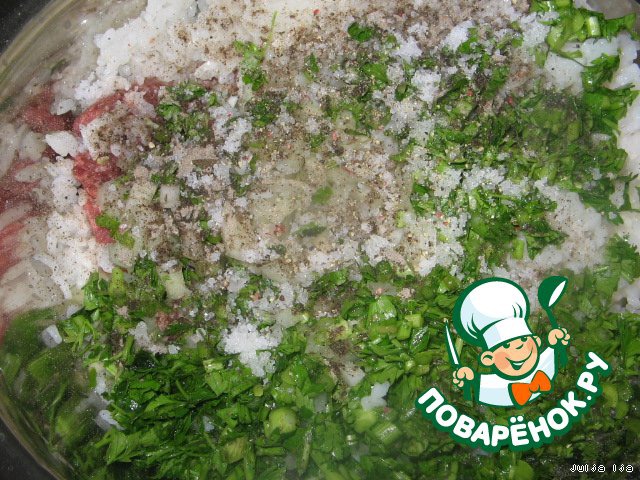 Одну луковицу нарезать мелко, добавить в фарш. Также добавить мелко нарезанную зелень, рис. Посолить и поперчить - по вкусу.