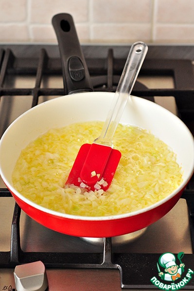 В сковороде (d=23 см.) растопить сливочное и растительное масло. Обжарить до мягкости и золотистого цвета нарубленный мелко чеснок и репчатый лук, нарезанный кубиками.