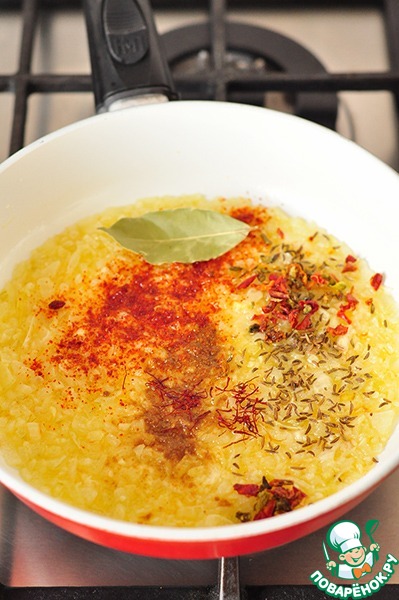 Добавить в сковороду тмин, паприку, хлопья перца чили, молотый имбирь, щепотку шафрана и лавровый лист. Перемешать специи с обжаренным луком, и тушить минуты две.