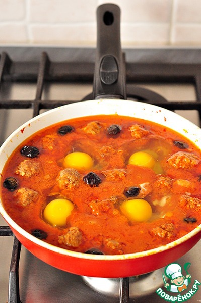 Затем, поверх соуса с тефтелями, разбить яйца, добавить оливки, закрыть крышкой и тушить ещё 8 минут, до готовности "глазуньи", чтобы белки стали белыми, а желток был жидким.