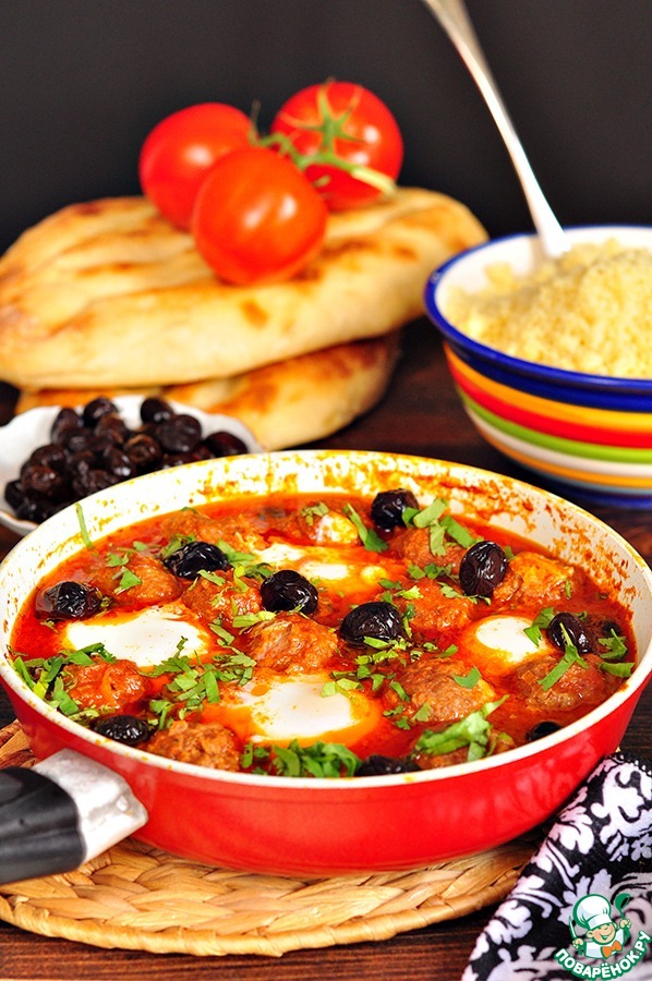 | У меня сегодня очень вкусное марокканское блюдо - Kefta Tagine. Именно такой подают в марокканском ресторане Le Timgad в Париже, который расположен недалеко от Триумфальной арки (если будете проходить мимо, зайдите попробовать оригинал))). Отличительной чертой этого тажина является наличие в нём тефтелей из баранины, тмина, паприки, шафрана, яиц "глазунья" и оливок. Лучше всего подавать такой тажин с кускусом, но и с рисом тоже будет не плохо. И обязательно (!) подать свежие лепёшки! Ими очень вкусно вымакивать пряный томатный соус и жидкий желток, вытекающий из "глазуньи". И про кинзу, про кинзу не забудьте! Именно она завершает и собирает воединно всю вкусовую гамму. Естественно, тажин готовят и подают в определенной национальной посуде, но и в сковороде он получается ничем не хуже))) |