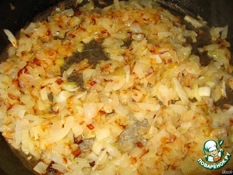 Обжариваем лук в сливочном масле (50 г) до золотистого цвета.